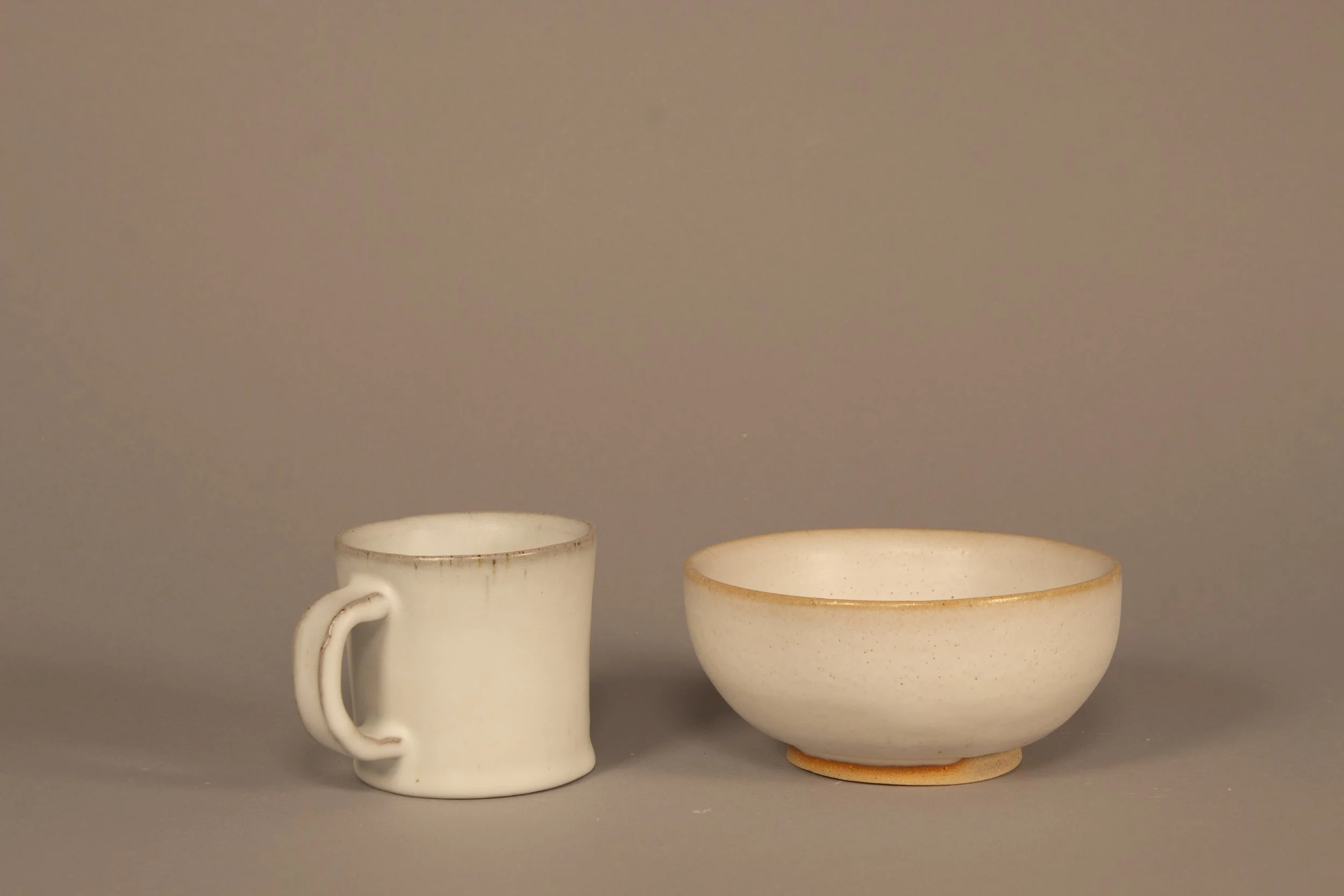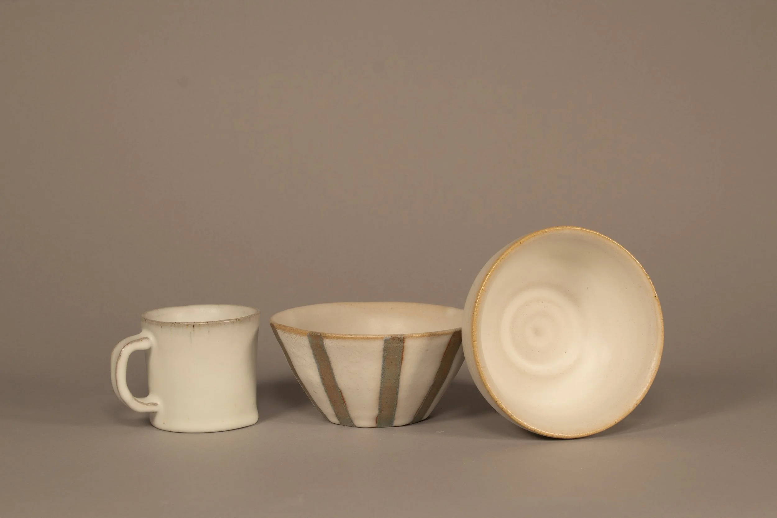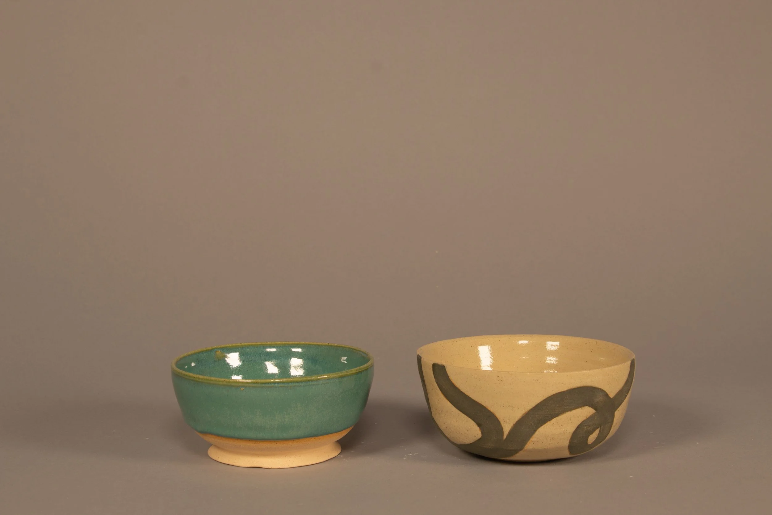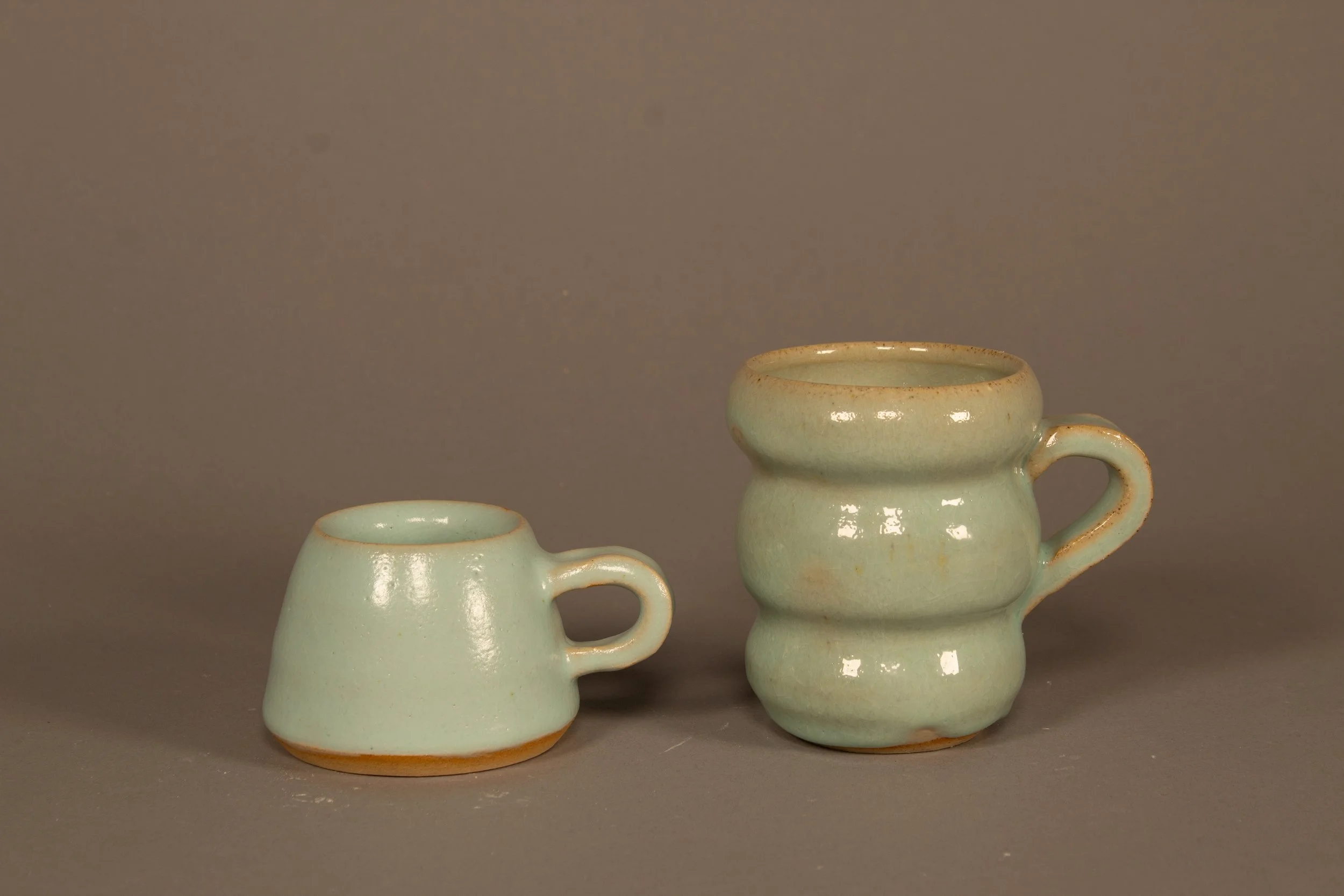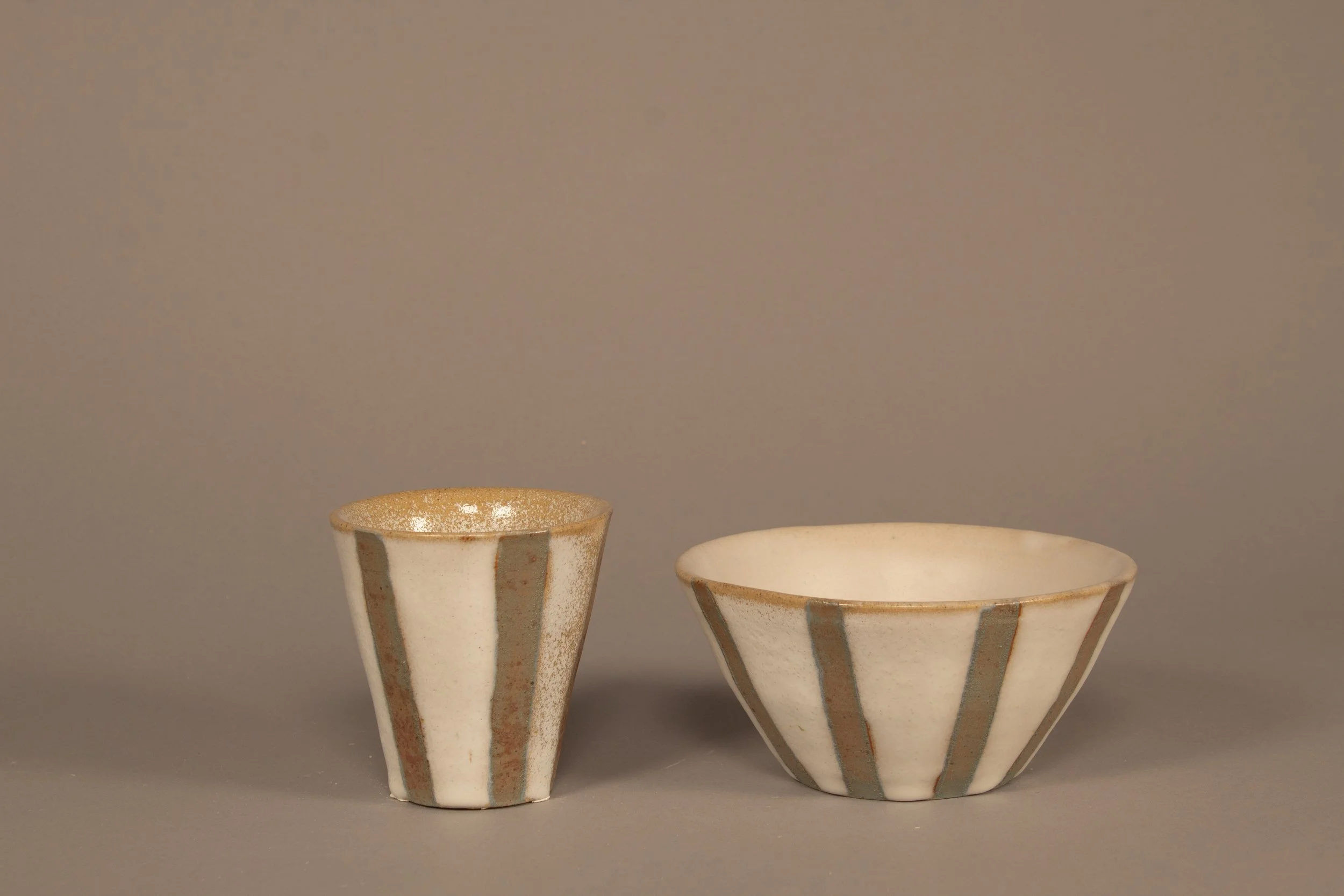 This collection of functional ceramic pieces are from a wheel thrown project in Ceramics I. It was through the creation of these pieces that I learned how to throw clay into forms on the wheel and finish pieces through processes including trimming, glazing, and firing. These pairings of pieces were created with the intention of being used together as sets. Sets including the “Glossy Green Bowls” and “Striped Set” use surface decoration techniques including waxing and unglazed clay. While, sets including the “Eggshell Mugs” and “Mixed Cortado Cups” show the use highly manipulated forms through both the throwing and trimming processes.