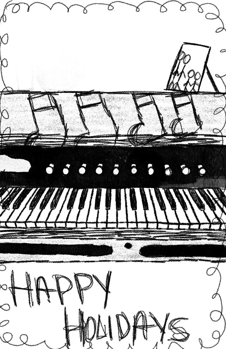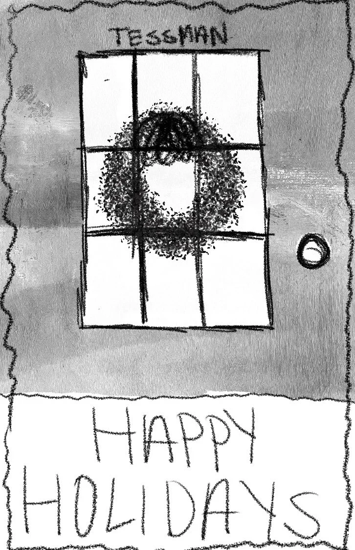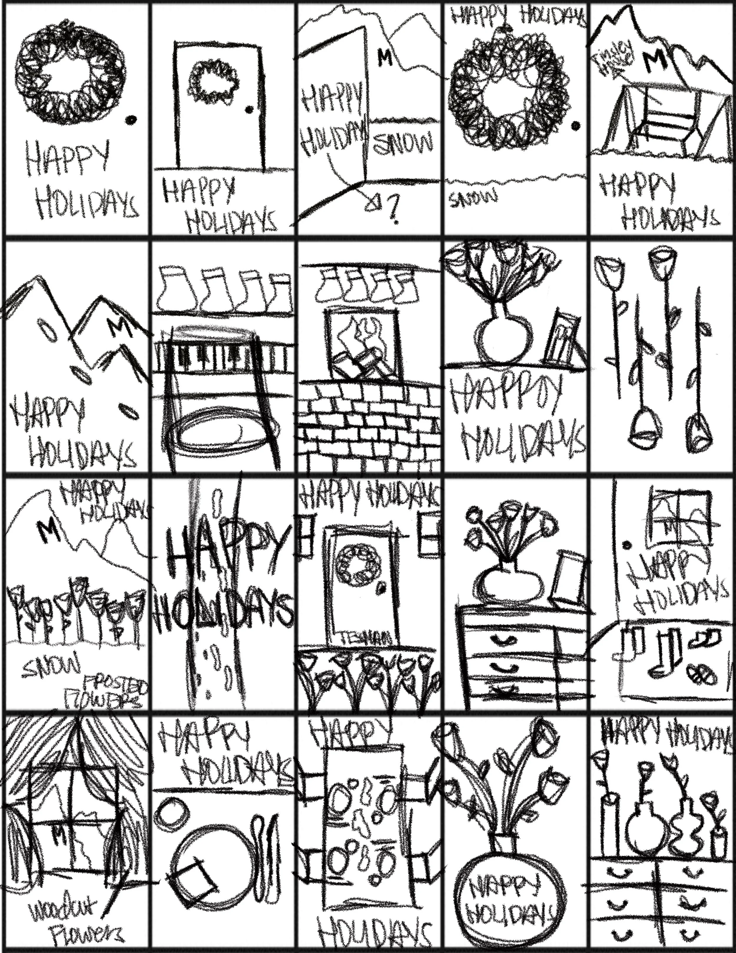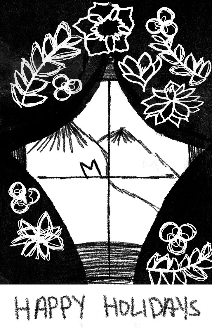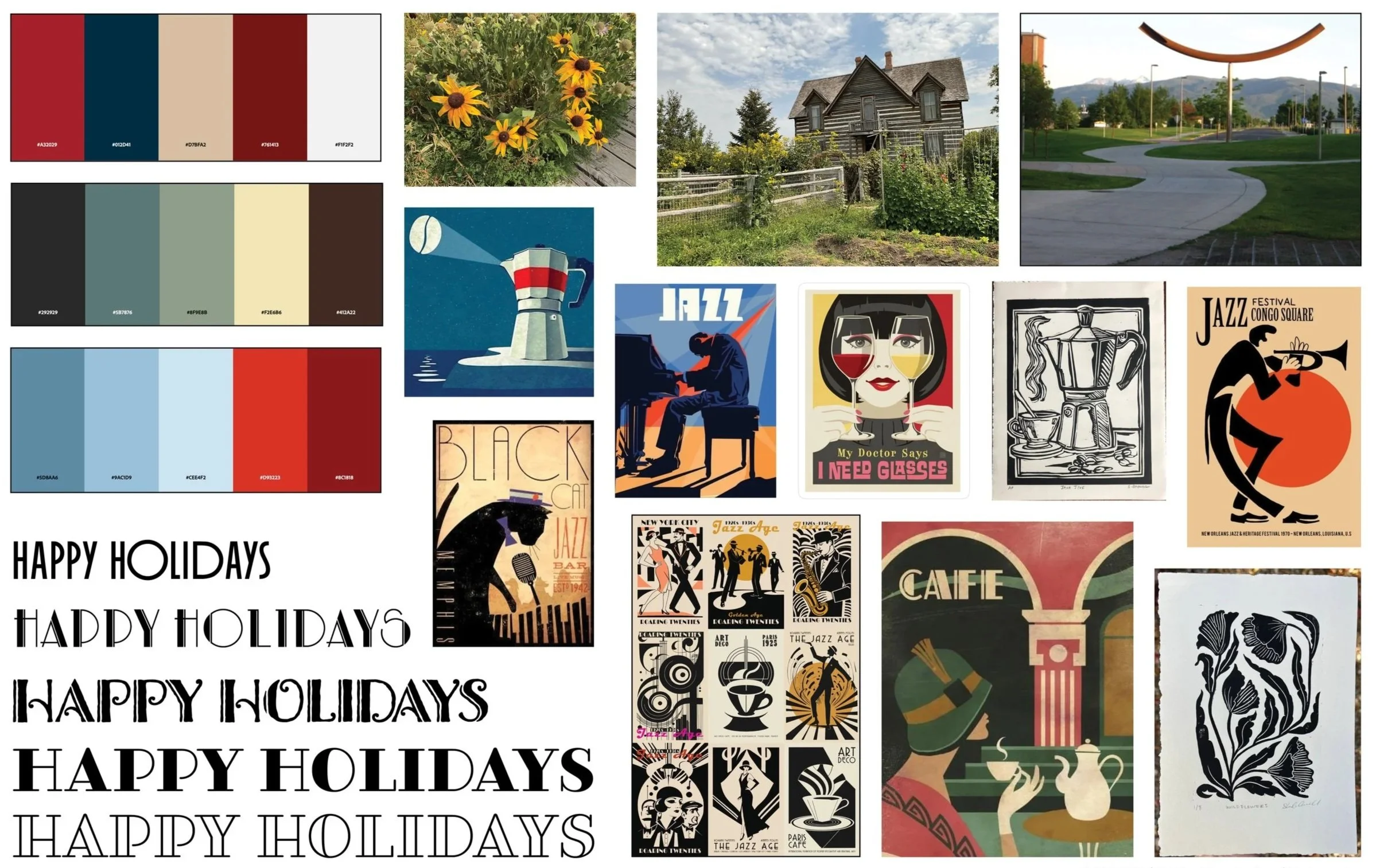 This card design for the family of President Tessman is inspired by the home as a symbol of tradition, warmth, and familial values. Hearing from Brock, Kristin, and their daughter Leona inspired the inclusion of each family member’s interests into the artistic details of the piece; Leona’s immediate interest in flowers directed the foliage surrounding the home, while Kristin’s appreciation for the quiet, stillness of Bozeman winters is reflected in the nighttime setting. Brock’s admiration of the Art Deco era shaped the typography, adding elegance to the timeless composition. The color palette is influenced by classic holiday themes in combination with subtle use of Montana State University’s iconic blue and gold. At its heart, the design celebrates the beauty in the mundane, portraying the family gathered together inside the home—a tribute to connection, memory, and the community of Bozeman.